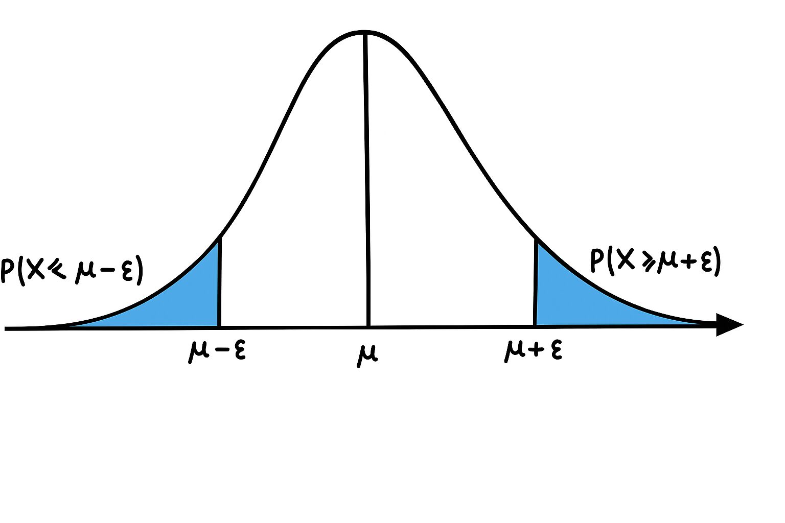 - \(P(|\hat{\mu} - \mu| \ge \epsilon)\): 標本平均と真の平均の差の絶対値が \(\epsilon\) 以上になる確率(両側裾確率)